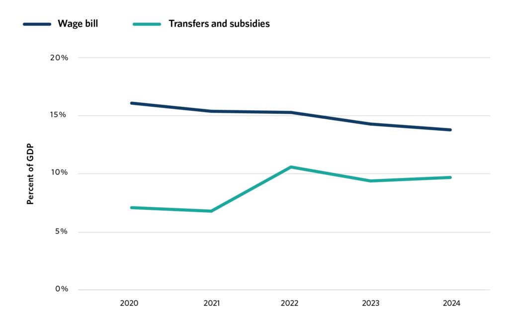 Further, partial financial-sector steps, such as a draft foreign-exchange code to liberalise and simplify forex transactions and plans to audit state-owned banks, are incremental. Without a clear political mandate to implement broader State-Owned Enterprises (SOE) reforms, these moves will not change the fundamentals of the system. Indebted SOEs are forced to cut imports, especially with limited external financials, triggering basic-goods shortages. While inflation has eased, it remains high, particularly for food. This, coupled with rising unemployment, has imposed severe economic hardships on common Tunisians. Governments in the past have dealt with these issues by increasing public employment and food subsidies. These are the exact types of initiatives that have fiscally pressured the country into an economic downfall. Despite the economic stresses, the rise in transfers and subsidies was larger than the marginal fall in the wage bill, as evidenced by Figure 1. Therefore, while sectoral initiatives in food security, energy and infrastructure have helped enhance economic activity and food security, they have long gestation periods. Their benefits will accrue over the years and might be able to plug immediate fiscal holes.