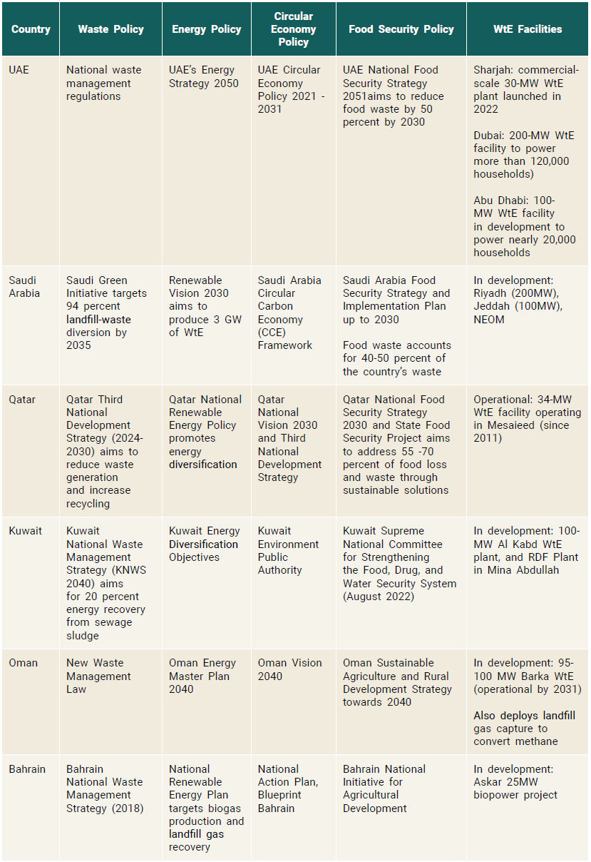 Waste-to-Energy (WtE) refers to the process of generating electricity or heat from waste treatment.7 While incineration tends to be more prevalent, anaerobic digestion (AD) and pyrolysis are commonly deployed to convert organic matter into biogas and bio-fertiliser.8 Converting waste into energy presents several co-benefits, namely strategic waste management enforcement, landfill diversion, material recovery, resource looping, and contributions to renewable energy. Given converging national commitments towards promoting circular economy principles and reducing food loss and waste, WtE through AD and pyrolysis offers a nascent yet economically viable solution to address agriculture and food waste, meet facilitylevel energy needs, and promote regenerative agriculture. This article assesses the evolving WtE landscape across the Gulf, evaluating opportunities and key challenges to leverage WtE within the region’s rapidly expanding agriculture sector.