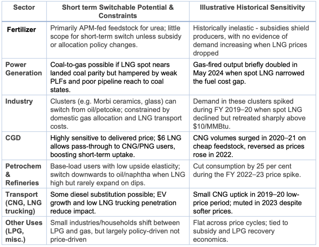 Short-term gas demand hinges on switchability, the ability of sectors to revert from alternate fuels (oil, petcoke, coal, Liquefied Petroleum Gas or LPG) to gas once prices soften. The table below outlines historical sensitivities, but the core insight is clear: India has pockets of highly responsive demand, though they are unevenly distributed.