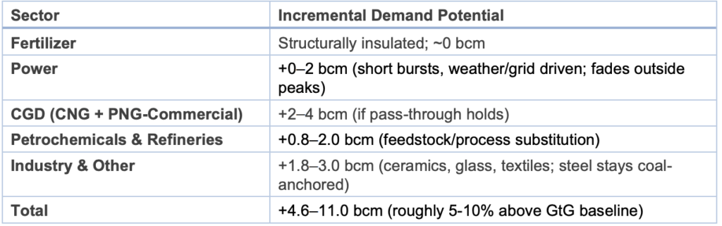 Strong, rapid upside appears primarily in industrial clusters; City Gas Distribution (CGD) commercial and transport segments; and select refinery and petrochemical operations where fuel and feedstock switching is feasible. Peaking power generation can also respond, though only in short, weather or grid-driven bursts rather than sustained runs. Fertiliser, however, remains structurally insulated, APM-fed and subsidy-protected, offering little short-term elasticity.