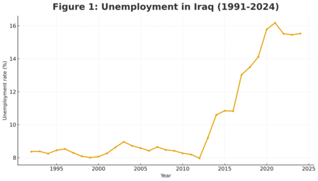 The vote could become a referendum on an economic model that juxtaposes substantial oil wealth with persistent governance and service-delivery challenges. The core issue remains a well-documented reliance on oil, which accounts for nearly 90 percent of state revenue and has fostered a political economy more centred on distribution than diversification. With ministries directing three-quarters of the economy, the majority of the non-state, non-oil economy is informal and cash-based. These hydrocarbon receipts finance a large public sector that employs about 4.5 million Iraqis, shaping labour-market incentives and the state’s fiscal profile. The associated wage bill absorbs a substantial share of the budget, constraining capital outlays needed to address infrastructure gaps as reflected by recurring electricity outages and acute water crises. Moreover, Iraq’s population is young, yet many entrants to the labour force face limited opportunities. The World Bank reported that 15.5 percent of the total labour force was unemployed in 2024. The unemployment rate has been rising over the past decade, as seen in Figure 1.