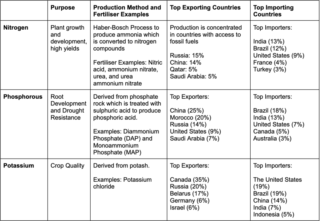 Table 1: Breakdown of Key Fertiliser Macro-Nutrients and Top Exporters and Importers