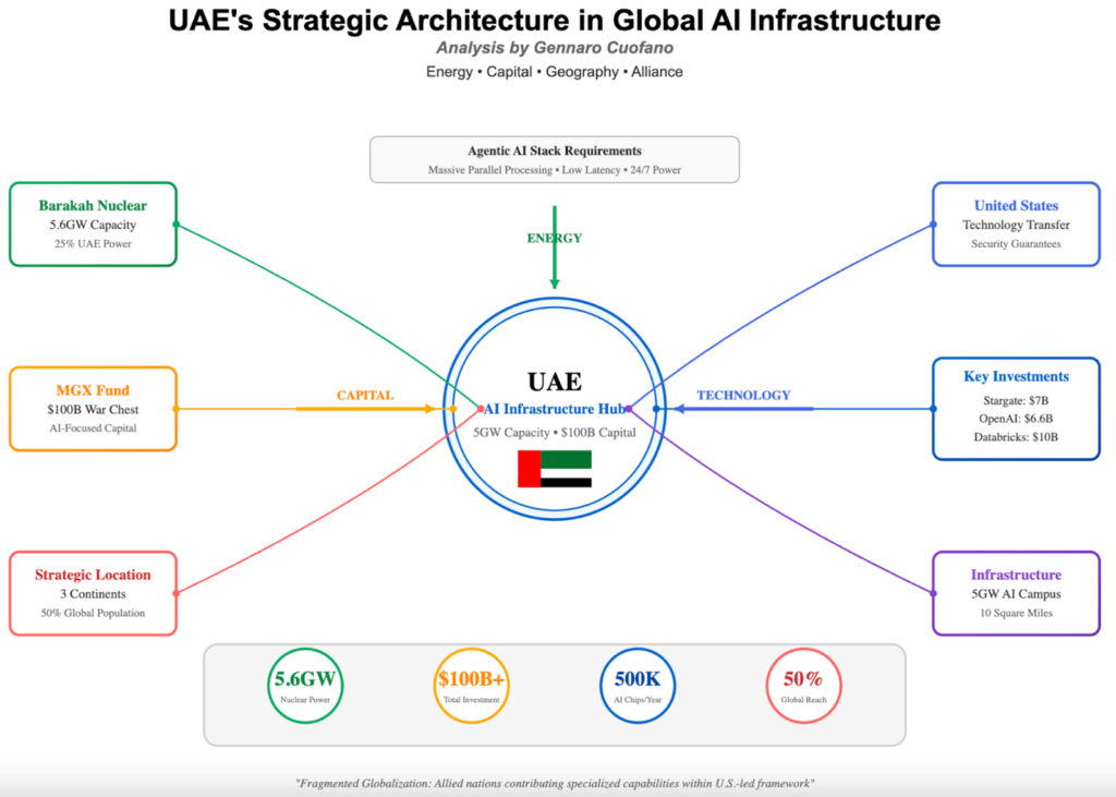 Capital Recirculation: The UAE’s investments through MGX create bidirectional flows—Gulf capital financing US AI development, while US technology and expertise flow back to establish Middle Eastern AI infrastructure.