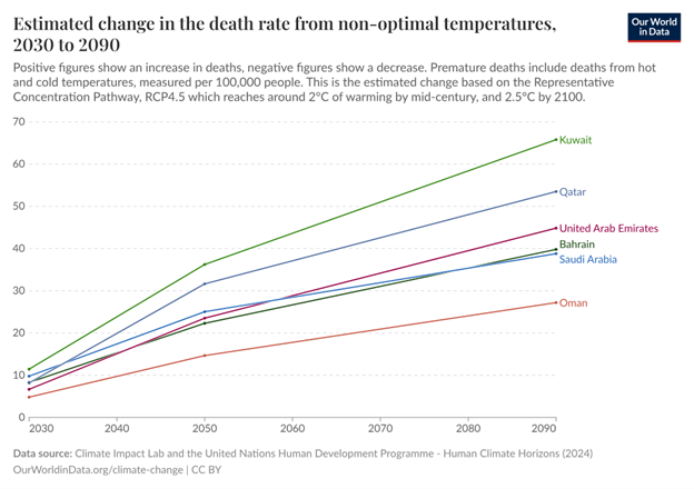 Health: Heat stimulates the ozone and air pollutants, exacerbating respiratory illnesses, inducing heat stress, and raising respiratory mortality rates.[14] Across the GCC countries, labourers in outdoor construction, oil-fields, and agriculture, for example, are at greater risk of heat illness and injury, with low-income families experiencing a double burden of occupational heat and indoor chronic exposure.[15] Without climate action, the death rates from non-optimal temperatures are projected to reach up to 65.79 per 100,000 people in the Gulf region by 2090.[16] Opportunities lie in implementing heat-health early warning systems and spreading awareness of preventive heat protocols to reduce pressure on medical services.