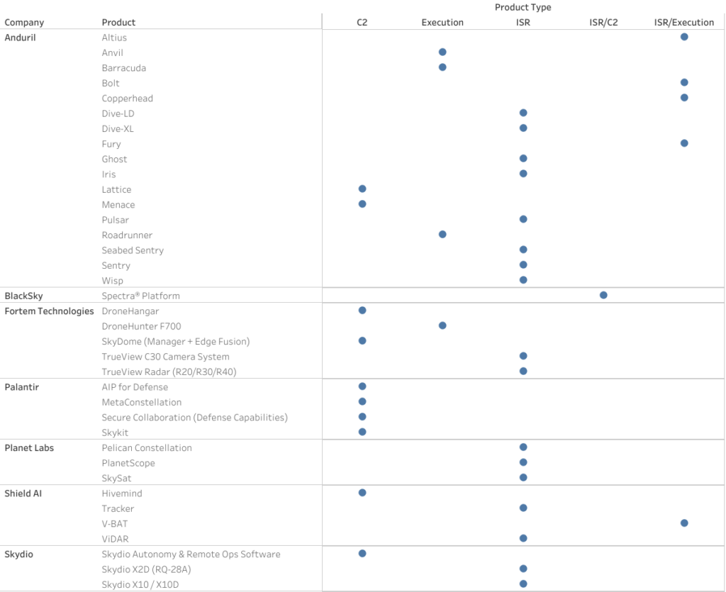 Figure 2 below compiles a catalogue of products developed by some of the leading US-based defence tech companies. These products are categorised by their primary functions, such as command and control, communications, or execution. Products with multiple roles are also highlighted to reflect their cross-functional capabilities.