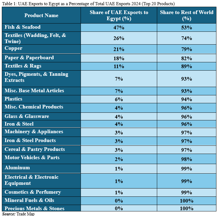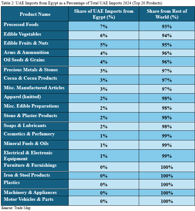 | UAE | 7% (Processed Foods) | 6% (Edible Vegetables) | 3% (Precious Metals/Stones) | 2% (Apparel) |