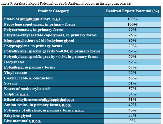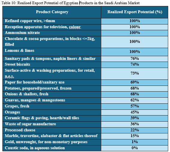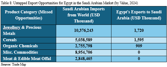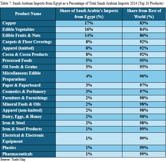 | Saudi Arabia | 16% (Edible Vegetables) | 14% (Edible Fruits) | 17% (Refined Copper) | 8% (Apparel & Textiles) |