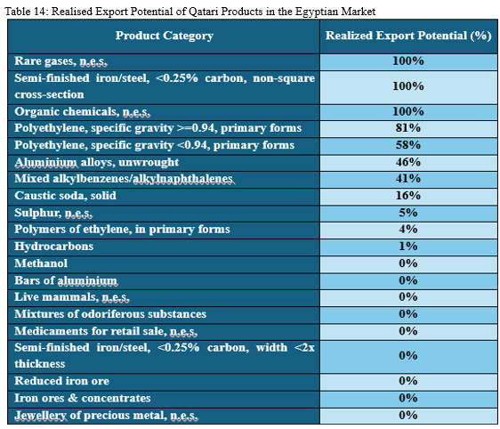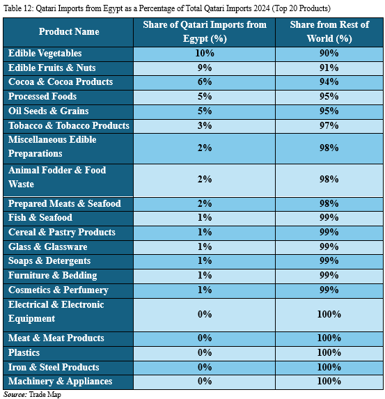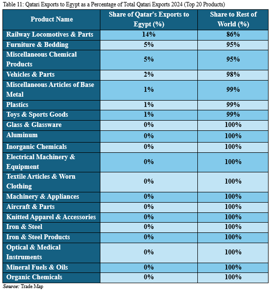 Trade with Qatar follows a distinct state-led logic. The post-2017 expansion in Egyptian agricultural exports is closely aligned with Qatar’s food security strategy rather than private-sector market dynamics. Data shows that “Edible Vegetables” and “Edible Fruits” now account for 10 percent and 9 percent of Qatar’s total imports from Egypt, respectively.[i]