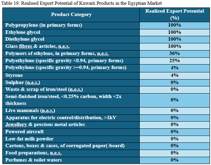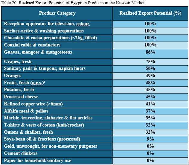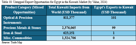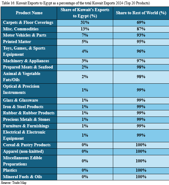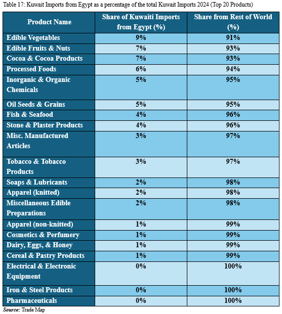 Kuwait represents a legacy model in which merchandise trade is structurally weak relative to the size of the economy. Egypt’s high market shares in “Edible Vegetables” and “Edible Fruits” accounting for 9 percent and 7 percent of imports, respectively, are closely correlated with household demand linked to the Egyptian expatriate community.[j]