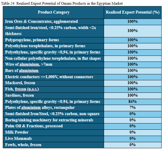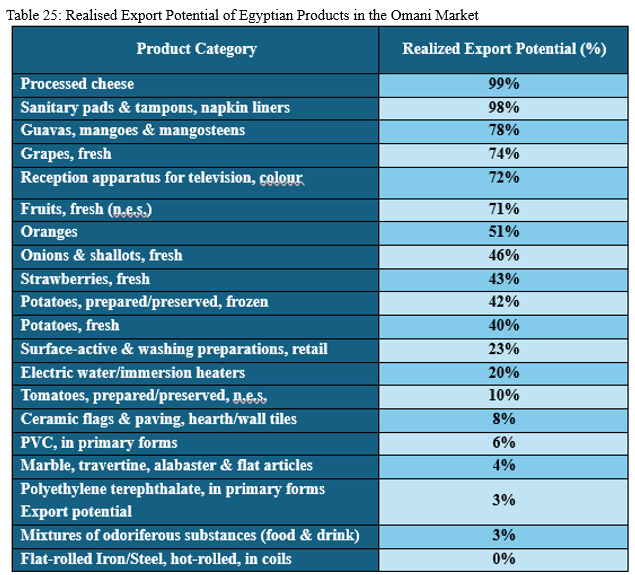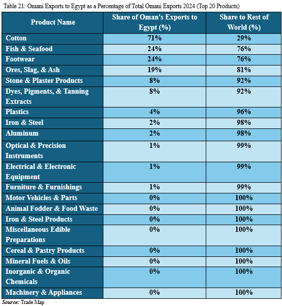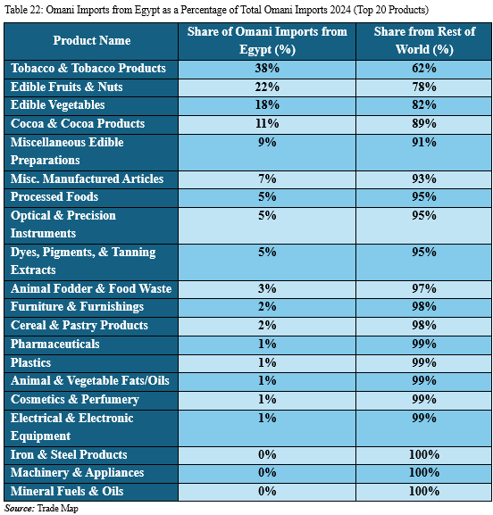 Trade with Oman is characterised by a highly concentrated factor-based exchange. Egypt holds a substantial market share in specific niches, such as “Tobacco Products”, which account for 38 percent of Oman’s imports from Egypt, and “Edible Fruits” at 22 percent.[k] This pattern highlights a persistent value-added gap, where trade is driven by raw or semi-processed goods.