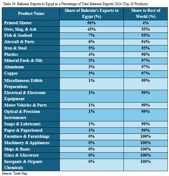 Bahrain’s trade relationship with Egypt is constrained by scale and fiscal capacity. Unlike larger GCC economies, trade is concentrated in narrow industrial verticals. Egypt holds a significant 23-percent share in “Tobacco Products” and 18 percent in “Printed Matter”, reflecting a targeted value-chain linkage.[l]