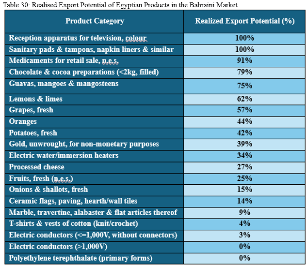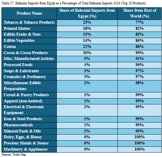 | Bahrain | 15% (Edible Fruits) | 14% (Edible Vegetables) | 23% (Tobacco) | 18% (Printed Matter) |