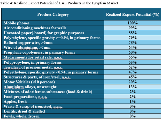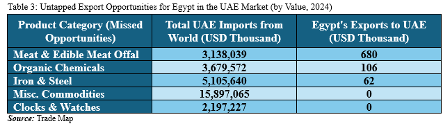 The UAE functions as a logistical hub mediating triangular trade. This creates a “tech arbitrage” dynamic where value is captured through logistics rather than manufacturing. This disconnect is starkly evident in the unrealised potential data: while the UAE imports a colossal US$15.8 billion in “Miscellaneous Commodities” globally, Egypt captures a zero-percent share of this market.[h] Similarly, Egypt holds a zero-percent market share in the high-value “Clocks and Watches” segment, highlighting the failure to penetrate core Emirati luxury and industrial sectors.³