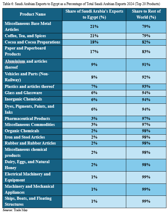 The second dominant export category comprises mineral products and construction inputs (HS Codes 25 and 74). These goods feed the Gulf’s infrastructure and real estate megaprojects but are typically exported in raw or semi-finished form. A prime example is the Saudi market, where refined copper exports capture a 17-percent share of the inbound trade flow from Egypt.[c] The limited presence of downstream processing reflects Egypt’s persistent “missing middle,” constraining its ability to move up regional value chains.